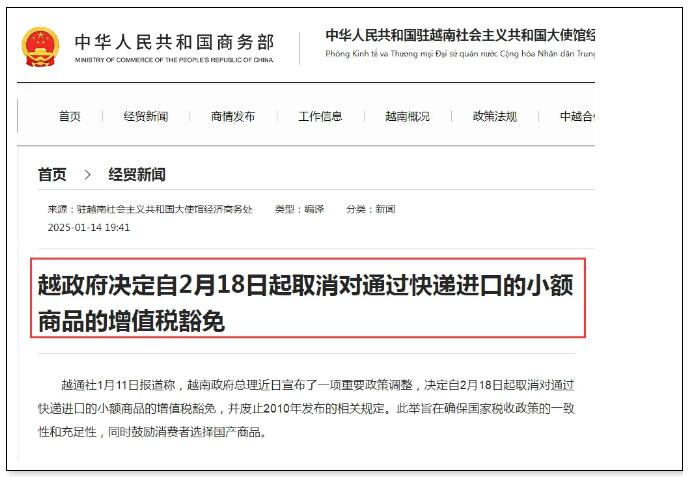 决定自2月18日起取消对通过快递进口的小额商品的增值税豁免,并废止2010年发布的相关规定。